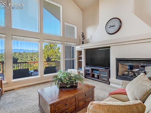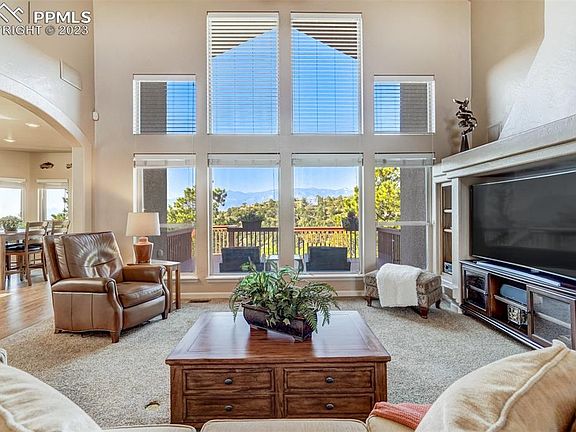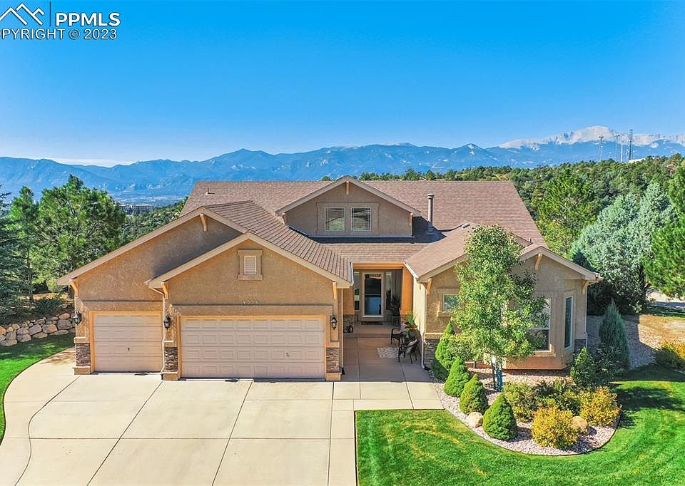 Welcome to this beautifully appointed ranch style home, meticulously landscaped, in the exclusive community of University Park w/ panoramic views of our majestic mountains, the Austin Bluffs & sunset skyline. This modern home offers 4 bedrooms, 3 bathrooms, custom open kitchen, formal & informal dining, a complete laundry room w/pantry-storage closet, generous walkout deck, full basement & 3 car oversized garage. Exuding comfort & privacy, upon entry you are visually greeted by an expansive great room w/floor to ceiling windows showcasing the incredible Pikes Peak views. This warm, inviting living area flows effortlessly w/satin finished hardwood from the entry. Moving to one side is the formal dining area & straight ahead the architectural features of the great room include vaulted ceilings, a grand fireplace wall complete w/built in bookcases & media area, an arched entry into the kitchen w/custom design elements including quality stainless appliances, granite stone counters & island, crown molded maple cabinets w/upgraded pull out storage, deep under mounted double sinks, double ovens, gas cooktop, desk station, informal dining area & walkout to an incredible deck of outdoor living space, including gas stub for grilling. The opposite side of this spacious main level features a guest bedroom, full bathroom & the luxurious primary bedroom retreat w/mountain views, deck access & an opulent bathroom that includes a dual sided fireplace, stone tiled floors, double sink counter space, soaker jacuzzi tub, walk in oversized steam shower, toilet room w/linen closet, & large walk in closet complete w/built in cabinets & closet system. The expansive finished garden level basement features a large family room w/the 3rd gas fireplace, tiled bar area, separate 14x21 craft room, 7x9 nook used as a workout space, 2 bedrooms & large storage/utility room. This beautiful home exudes elegance, comfort, & the ease of main level living. Meticulously preserved, a true residential gem.