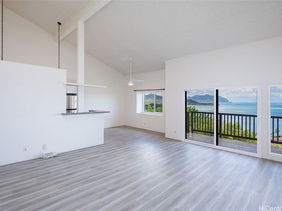 Stunning Ocean, Kaneohe Bay and Koolau Mountain views! Located in one of the best locations throughout the complex in building 12. Remodeled kitchen, new vinyl windows, new vinyl floors plus a desirable floor plan which feels like a single family home. Vaulted ceilings throughout the living room, dining room, kitchen & top floor bedrooms. Windows across the makai/oceanside wall allows for tradewinds to keep this awesome home breezy and cool. Resort-like amenities; swimming pools, tennis courts, clubhouse, BBQ areas, tropical walking/jogging pathways, security on property + pet friendly. Optimal location! Close to restaurants, medical offices, markets, farmers markets, Windward Mall, military bases, easy access to freeways. Selling "as is." Single car garage plus additional assigned parking/tandem. Ample guest parking.