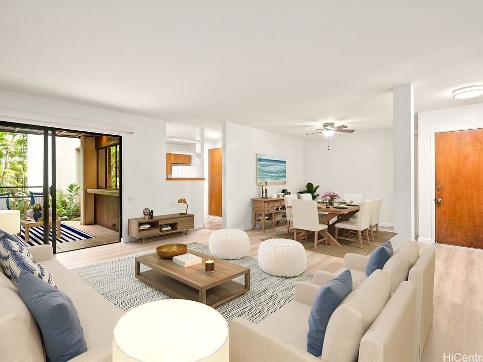Highly desirable corner end unit on ground floor, large one bedroom and one bathroom unit in Puu Alii 2-2. Living room, bedroom floor is newly installed in 2023! Two gardens in this property, specious covered lanai with Koi pond and beautiful lush garden views. Perfect for having a cup of coffee and reading books, or serving refreshments from the pass-through kitchen window for entertaining. Another courtyard located off the bedroom, great area for gardening and pets. Ground floor means no stairs to climb up and one assigned covered parking is close by. There is plenty guest parking as well. This is an opportunity to own and live in your tropical oasis in Windward Oahu. Enjoy all the amenities which include pools, tennis courts, recreation area, sauna, BBQ and more! Stroll to Safeway, Longs Drug, Post Office, restaurants, entertainments, and all your shopping needs. One or more photos have been enhanced.
