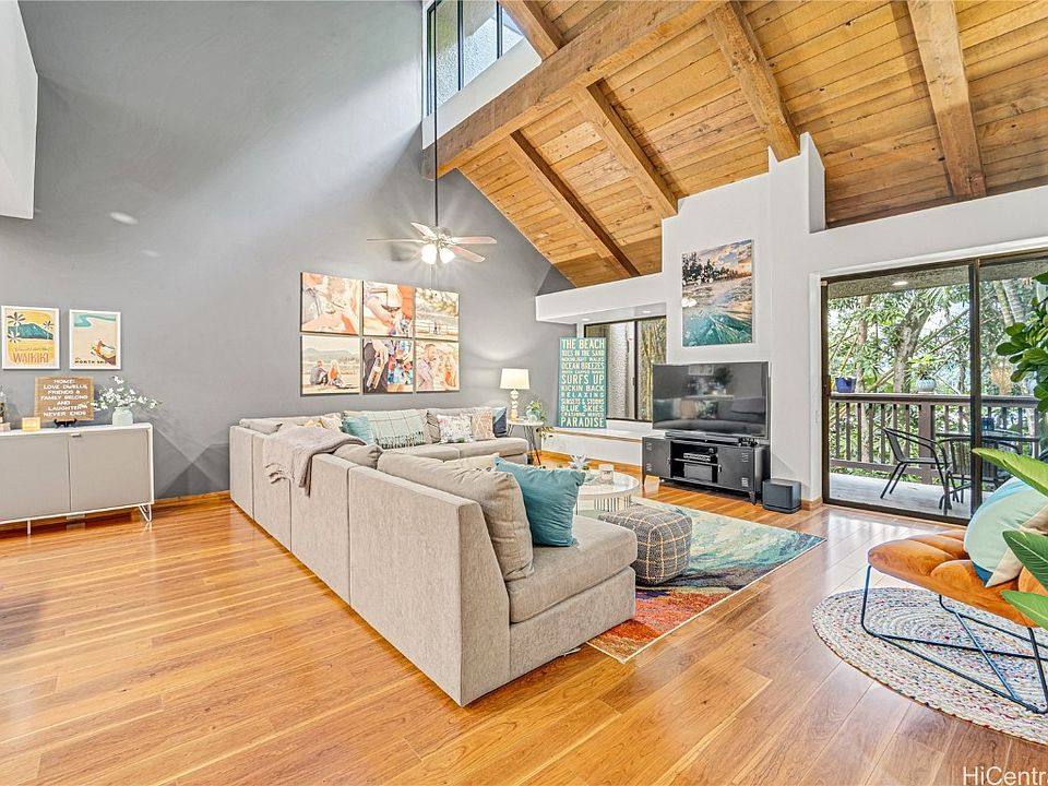 Escape to relaxed Hawaii living at this beautiful townhome, tucked up next to the Koolau mountain range. This property is one of the most sought-after models in Eden at Haiku Woods. This townhome is an exceptional choice for anyone looking to live in comfort and style. The spacious great room features cathedral ceilings and is part of an open concept floor plan, connected to the newly remodeled kitchen. Enjoy your morning coffee on your private lanai overlooking a tropically landscaped view. Home features easy to maintain hardwood & ceramic tile floorings and new stainless-steel appliances. The primary suite is spacious, featuring an oasis of peace and relaxation, two bedrooms downstairs open to the garden, each room provides ample storage space. A multipurpose room can be used as an office/craft room. Property is pet-friendly and features a recreation area pool, hot tub and walking paths. You are less than 25 minutes from JBPHH, Kaneohe Marine Corp Base and downtown Honolulu. Within a 2-mile radius is Safeway, multiple dining options (to include island favorite, Haleiwa Joe’s), and soon coming to Windward Mall is Target.