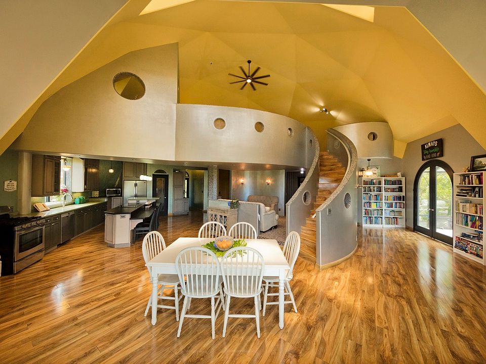 The curved, tile-capped staircase and port holes invite you to the top level. This enormous open space, with its light, airy atmosphere and soaring geodesic ceiling, can be the primary bedroom, yet currently houses three children. The tiled pony wall and port holes frame the semi-circle, and includes a walk-in closet and tiled half bathroom.