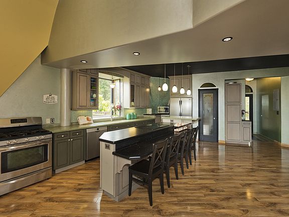 he open concept main floor features a large kitchen with jewel-speckled countertops, huge island with electric stovetop, gas stove/oven, walk-in pantry, plenty of storage, and picture window. The dining area, step-up reading or breakfast nook with huge picture windows, and central family room are designed to invite everyone together for those all-important daily meals and gatherings. A laundry nook, fully-tiled bathroom, and primary suite with attached work space, complete the main level.