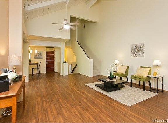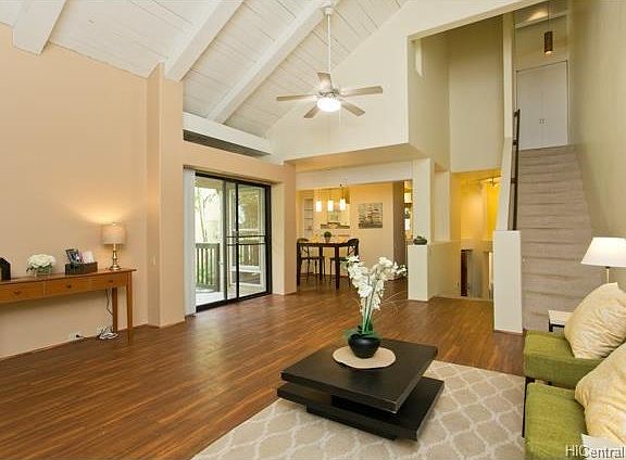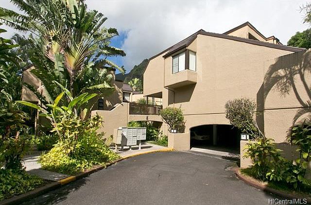 Peaceful and serene living at Haiku Woods, an exceptionally well-maintained community. 3/2 tri level home, with rare enclosed upstairs master suite with walk in closet. Extensive storage space throughout home, large living area, expanded and upgraded upper lanai, new tile in entry, upgraded flooring throughout first and second floors, two lanais, potential space for fourth bedroom/den, two covered parking spaces new washer and dryer, and dehumidifier included. Pet friendly community, recently renovated community pool and recreation area, new roof and gutters, and paint. First Open house 9/17/2017