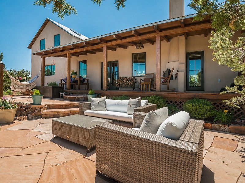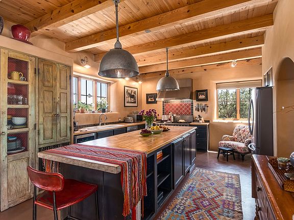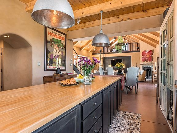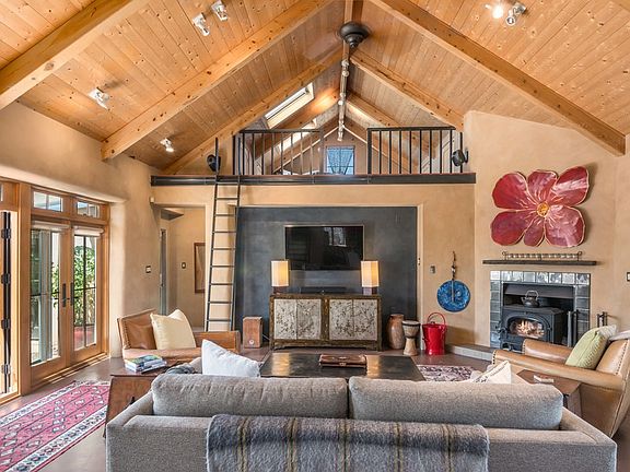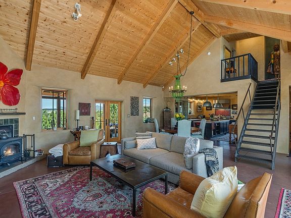 Contemporary northern New Mexican pitched roof home sited on a high ridge capturing sweeping mountain views. A restful and beautiful home with an airy open design, stained concrete floors, and plaster walls. Large glass doors open to garden courtyards extending northeast and southwest, creating a perfect setting for relaxing and entertaining. There is a fabulous chefs kitchen with professional six burner gas range, upgraded appliances, and new wine cooler. An industrial steel staircase leads to the private master suite with a lovely balcony with views, a newly renovated master bathroom - including walk-in steam shower, soaking tub, marble sinks, and hand painted tile floors - and a private office and walk-in closet. On the opposite side of the living area is a light-filled loft space for reading, meditation, etc. The separate guest wing has two bedrooms each with access to the courtyard/ patio. There is additional art studio/ workout space conveniently located off of the courtyard, and fenced in yard for dogs. Built from straw bale construction, and passive solar design, this is an energy-efficient, peaceful getaway close to Eldorado amenities, hiking trails, and Lamy train station!