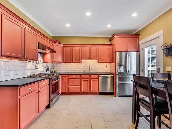 No detail has been missed in this meticulously renovated townhome - high ceilings, tasteful architectural features, hardwood floors, and large bright windows define the space. Gracious foyer with an elegant stairway leading to a spacious living room w/hardwood floors and built-in shelving. Large, renovated kitchen w/stainless steel appliances, stone counters, generous cabinet space, heated tile floor, and dining area. Step directly outside to a private, fenced yard, with installed gas grill - an ideal place to relax or entertain. Upstairs find two sizable bedrooms plus a third with custom built-ins that make it an ideal office. Both bathrooms have been completely renovated. The full bathroom upstairs showcases dual sinks and clean, modern tile - truly a retreat. For convenience, there are two off-street parking spaces directly behind the building and a full basement for storage. Close to public transportation, commuting routes, park, and all that Moody Street has to offer.
