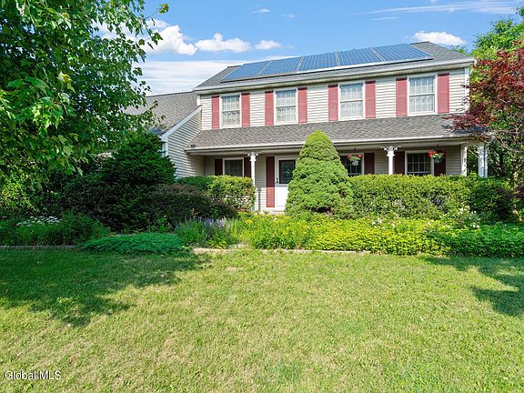 Peace, Convenience & Plenty of Space! This Colonial offers the best of both worlds: a tranquil location & easy access to everything. Radiant-heated addition w/walk-in closet & full BA makes multi-gen living a breeze. Flexibility to choose your primary suite, handicap-accessible on the 1st floor or spacious haven on the 2nd. Gleaming cherry floors grace the LR & DR. The inviting 3-season room allows you to soak up the winter sun or enjoy cool summer breezes. Enter into your own secret garden on the private stamped concrete patio w/a relaxing hot tub, watch for double-arch rainbows! Mature trees create a serene backyard. Enjoy peace of mind w/newer roof & eco-friendly solar panels. The full, dry basement features a Brightwall Basement Wall system for a finished look & plenty of storage. Peace, Convenience and Plenty of Space! This Colonial offers the best of both worlds: a tranquil location and easy access to everything you need. You will find room for everyone and everything with 5 bedrooms and 3.5 baths! A radiant-heated addition with a walk-in closet and full bath makes multi-generational living a breeze. Plus, you have the flexibility to choose your primary suite location - handicap-accessible on the first floor or a spacious haven on the second. Gleaming cherry floors grace the living room and dining room floors. The inviting 3-season room allows you to soak up the winter sun or enjoy cool summer breezes. Enter into your own secret garden and unwind after a long day on the private stamped concrete patio with a relaxing hot tub. Mature trees create a serene backyard escape, and you might even be treated to breathtaking double-arch rainbows after summer showers. Enjoy peace of mind with a newer roof and eco-friendly solar panels that keep energy costs low. The full, dry basement features a Brightwall Basement Wall system for a finished look and offers plenty of storage space.
