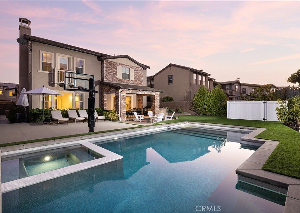 A true gem awaits on one of the most desirable streets in the Cirrus of Esencia community in Rancho Mission Viejo. Positioned on a generously sized lot, this four-bedroom, three-bathroom home spans approximately 2,768 square feet across two levels. Upon entering, the timeless charm of modern farmhouse touches—custom shiplap, crown molding, and elegant craftsman door trims—immediately captivates. Gorgeous wood flooring leads you into the expansive open-concept living area, where the kitchen shines with KitchenAid appliances, double ovens, quartz countertops, travertine tile backsplash, and a sprawling center island featuring bar seating and a farmhouse-style sink. Further along, a walk-in pantry, built-in shelving, and a dedicated coffee station are showcased. On the main level, a private guest bedroom with full bath are ideal for hosting or use as a home office. Thoughtful design continues with a custom-built mudroom, perfect for storage and organization. Upstairs, two built-in workstations provide an excellent space for study or remote work. Two additional bedrooms, both offering walk-in closets and newer flooring, share a Jack-and-Jill bathroom. One bedroom opens to a charming balcony, offering scenic views of the hills. The primary suite is a serene retreat, featuring a custom shiplap accent wall, dual walk-in closets with newer flooring, and a private balcony overlooking the beautifully landscaped backyard. Its spa-like en-suite bathroom includes double vanities, a soaking tub, and an oversized tiled shower. Outdoors, the private backyard impresses with a built-in fire pit, newer pool, newer spa, basketball hoop, and covered patio with a bench swing. A second patio, beside a peaceful fountain in the side yard, offers the perfect space for al fresco dining or quiet relaxation. In the two-car garage, newer epoxy flooring, a craftsman workbench, built-in cabinetry, and a tankless water heater ensure functionality and convenience. Minutes from award-winning schools, residents of Cirrus enjoy access to community amenities such as firepits, a game room, exercise room, playground, park, pickle ball courts, and community center.