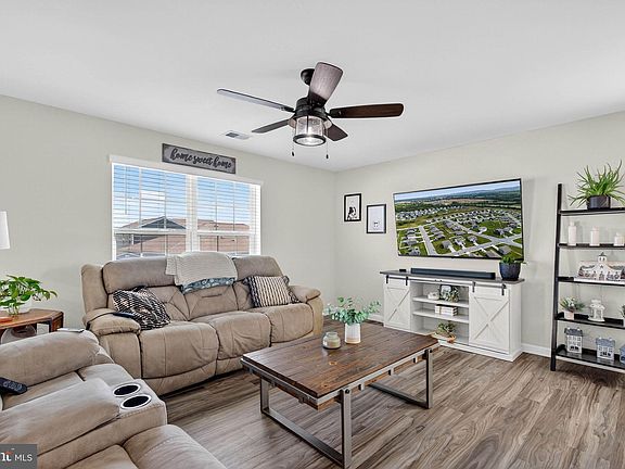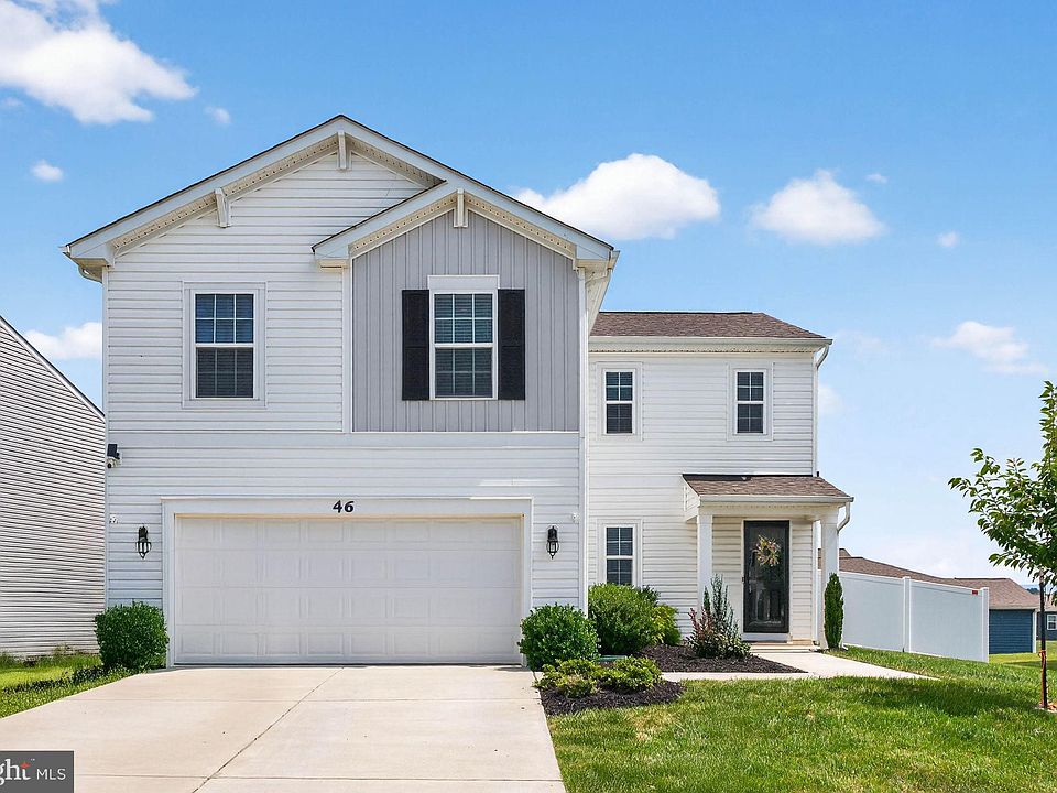 Welcome to 46 Bell Tower Lane, a beautifully maintained 4-bedroom, 2.5-bath home located in the sought-after Magnolia Springs neighborhood of Charles Town. Step inside to a bright and open main level where the living room and kitchen flow together seamlessly, perfect for everyday living and entertaining. The kitchen features granite countertops, a center island, stainless steel appliances, and a walk-in pantry, while the living area is finished with durable laminate flooring and a ceiling fan. A convenient half bath and interior access to the spacious two-car garage add function to the main floor. Upstairs, you'll find wall-to-wall carpeting throughout and a thoughtful layout that includes a second-floor laundry room with laminate flooring and a 60+ gallon hot water heater. The primary suite is a peaceful retreat with a large walk-in closet, ceiling fan, and an en suite bath featuring a double sink vanity with granite counters and a walk-in shower. The additional bedrooms are well-sized and share a full bath, also finished with granite. Outside, the fully fenced backyard offers privacy and a low-maintenance vinyl fence along with a concrete patio—ideal for outdoor dining or relaxing. Magnolia Springs is known for its peaceful streets, community feel, and convenient location close to commuter routes, schools, and local amenities, making this home a perfect blend of comfort and convenience.