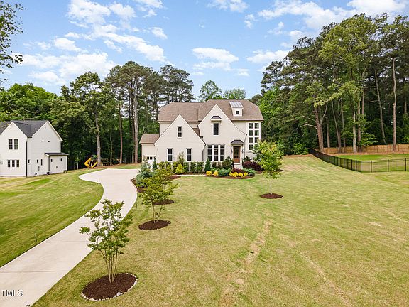 This stunning Parade of Homes luxury residence in Chapel Hill offers 5 bedrooms, 5.5 bathrooms, and sits on nearly 2 beautifully landscaped acres. A long entry driveway leads to a welcoming front yard and elegant exterior. Inside, you're greeted by a light-filled entryway with soaring ceilings and refined finishes throughout. The spacious open-concept living room features an exposed brick fireplace flanked by built-in bookshelves, perfect for cozy evenings or entertaining. The chef's kitchen is a dream, with stainless steel appliances including a gas range and island seating. It also includes an installed reverse osmosis water purification system for clean, high-quality drinking water. A huge scullery with a second dishwasher, open shelving, and prep space makes hosting large gatherings effortless. Modern chandeliers and designer lighting throughout the home add an elegant touch. Off the oversized garage, a spacious mudroom keeps things organized. The main floor also features a luxurious first-floor bedroom suite, ideal as a private guest or mother-in-law suite, complete with its own washer/dryer, California closet, ensuite bath, and built-in sink with mini fridge. Step through the living room to the covered lanai with fireplace - an inviting outdoor living space that feels like a retreat. Upstairs, the second primary suite boasts a spa-like bathroom with a soaking tub, stunning tiled walk-in shower, double vanities, and a large California closet with custom built-ins. Three additional bedrooms and well-appointed bathrooms provide space for everyone. The finished third floor is perfect for a media room, bonus space, or private home office, complete with a full bathroom. Outside, enjoy the expansive backyard with an outdoor deck, already ideal for entertaining and with room to add your dream pool. Located just minutes from NC-501 with quick access to shopping, dining, and UNC-Chapel Hill, this one-of-a-kind home combines luxury, location, and lifestyle. Don't miss your opportunity to own this exceptional property!