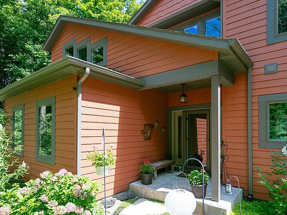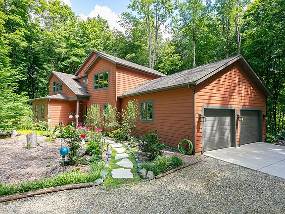 Don't miss this home by Stacy Custom Homes built in 2017. Designed with vaulted ceilings and a dramatic wall of windows, this 3 bedroom, 2.5 bath home offers a spacious floor plan, full basement, and attached 2-car garage. Located in Camp Madron, a private gated community surrounded by 260 acres of preserved beech-maple forest, the property combines modern living with a natural retreat. At the heart of the community is a 60-acre spring-fed, no-wake lake with sandy beach, firepit, swimming, kayaking, and paddleboarding. Residents also enjoy three miles of hiking and cross-country ski trails, plus direct access to the 45-acre Myron Perlman Nature Preserve. A full-time caretaker maintains the roads, snow removal, and shared spaces. Community features include an apple orchard, herb garden, individual garden plots, and a lodge available for private gatherings. Most of the furniture will stay. Please contact the agent for a complete list.
