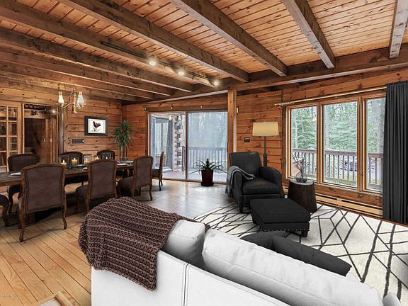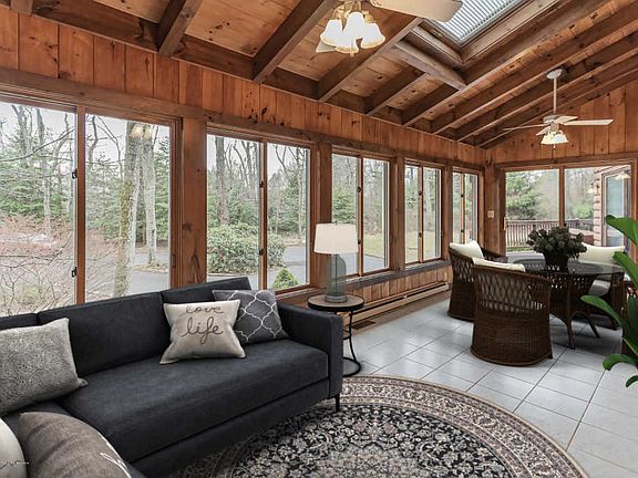 - RoomFamilyRoomFeatures: Skylight, Sliding Door, TRY/VLT/CATH, Two Story, Fireplace - Woodburning, Ceilings - Beamed, Dec Molding