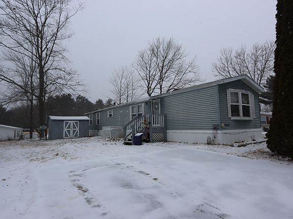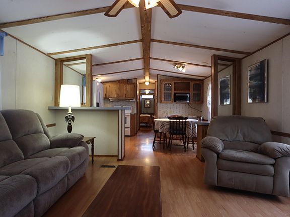 Partially furnished mobile in great condition with many improvements in place. Newer windows, roof; oil tank; and thermostat. Primary bedroom with bath; cathedral ceilings in living room and kitchen/dining area. New refrigerator, new TV, new couch & chairs. Don't miss out on this well maintained home in a desirable park
