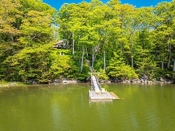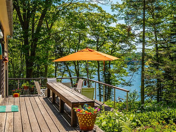 Stunning water views from almost every room in this light and bright 3 bedroom, 2 bath year round cottage on Collins Cove. This home features an open kitchen, dining and living space with a wrap around deck over looking the water. Paths meander through beautiful gardens to your bunk house or studio with a woodstove and continue further down to your own private dock where you can swim or take a paddle on your kayak or canoe. This house was designed and built by a Boston architect for his own use.