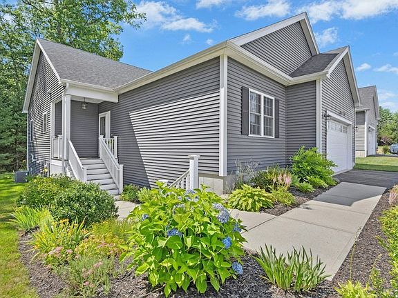 Well maintained and custom-designed young condo in exclusive 55+ community. This unit has privacy abutting woods & perennial garden along walkway This single-level living w/ open space floor plan and great natural light. Living room has gas fireplace, ceiling fan & hardwood floors with access to screened sunroom. Modern kitchen with granite island, gas stove, ss appliances & pendant lights. Dining room with chair rail, chandelier & crown modeling. Large primary bedroom has hardwood floors, custom walk-in closet, ceiling fan & additional closet. Luxurious bathroom with custom tiled shower, double sinks, granite counters & linen closet. Additional second bedroom with hardwood floors, ceiling fan & closet,. Full second bathroom with tub/shower, tiled floor & granite countertop. The screened porch with patio area is perfect for outdoor living & dining. Large spacious basement, plenty of room for additional space. Central Air. Gas Force Air Heat. Two Car Garage. Just 5 minute to Rte. 290