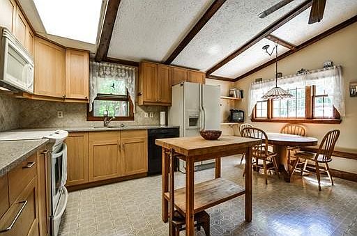 - Kit Dscrp: Flooring - Vinyl, Ceiling Fan(s), Ceiling - Beamed, Countertops - Upgraded, Wood / Coal / Pellet Stove, Exterior Access