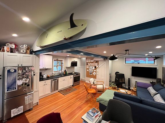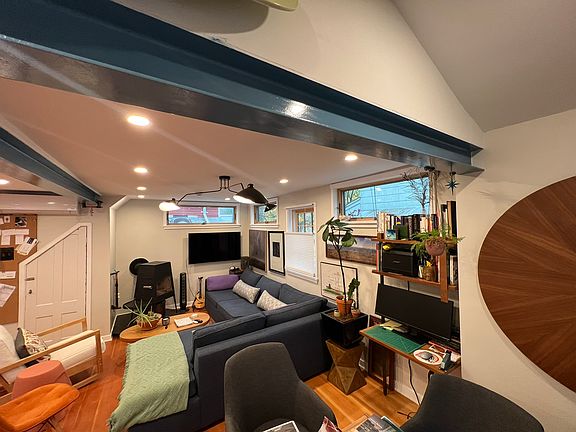 First floor is the kitchen/living area with a half bathroom and mudroom/laundry. Lots of windows, dishwasher, wood stove. courtyard with a fire pit and seating outside. Off street parking. High quality furnishings etc.