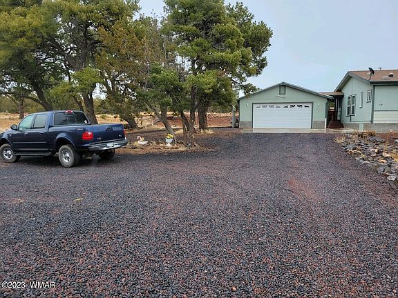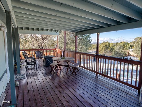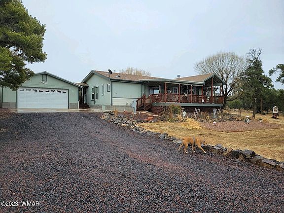 Just outside of Show Low, AZ is the home you've been waiting for. On one acre of land, totally fenced, is a 3 bed, 2 bath manufactured home with 1568 sf. Just the right size! Enjoy the living room with a fireplace and vaulted ceiilings. Formal dining area, plus eat in kitchen with an island. Primary suite has a den or sitting room plus large bathroom with garden tub, separate shower, dual vanity. Two bedrooms and a bath on the other end of the home. Covered decks, front and back so you can enjoy the seasons easily. Two car attached garage plus a two car carport. Fully fenced with two access gates. No HOA! Some furnishings convey.