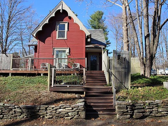 Overlooking the South River in the center of Conway; this remodeled farmhouse offers spacious rooms and lustrous wide pine floors. The former home of the Conway School of Landscape Design, wait til you see the 3 level semi-finished barn across the road and let your ideas run rampant for studio and workshop spaces. The exposed beams in the living room adds character and charm to complement the fireplace and aged wood wainscotting. The eat-in kitchen also has exposed beams. All rooms are bright and sunny; the bathrooms have been updated as has the wiring. The barn and sugar house across the street offer numerous possibilities for projects and crafts. Wonderful level yard with patio and decks to enjoy the outdoors. Make an appointment to see this enchanting village home.