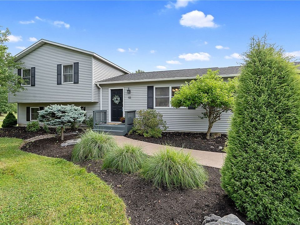 This stunning 3-bedroom, 2-bath split-level home sitting on almost 1.5 acres- is in immaculate condition and boasts a plethora of updates. With a newer roof, water heater, central air, and furnace, all the major ticket items are already taken care of for you.Step into the updated, spacious kitchen featuring beautiful granite countertops, custom wood trim, and an abundance of maple cabinets. The kitchen flows seamlessly into the adjacent dining room, creating an open and inviting first level perfect for entertaining.Upstairs, you'll find three bright and cheery bedrooms, each with ample natural light. The two full bathrooms have been tastefully updated, providing modern comfort and style.The finished basement area offers an Adirondack-style family room, perfect for cozy gatherings. You'll also find a good-sized laundry area for your convenience.Outside, enjoy the enormous newly paved driveway with space for six cars, and unwind on the new stone patio with a fire pit area, overlooking a private and serene backyard.