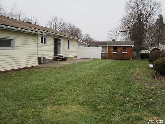 Impeccably maintained 2 bedroom, 1 bath vinyl sided Ranch with 1 car attached garage! Attractive eat in hickory kitchen with newer vinyl floor and stainless steel appliances, PLUS formal dining room with new hardwood floor & sliding glass doors to private rear yard patio! Living room with new carpet. Spacious bath with new solid surface sinks and counter and tile floor! 2 ample size bedrooms. Large heated basement rec room. Boiler heat plus central air and mostly all new vinyl windows, new front entry door and storm and kitchen door. Rear yard wooded shed!