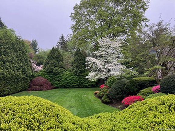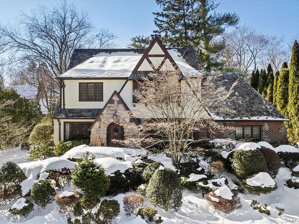 Step into this Fox Meadow storybook 1920s Tudor, full of abundant light, character and timeless craftsmanship. This distinctive home features interesting architectural details such as arched doorways, handsome beamed ceilings with dentil molding details, diamond pane leadlight windows with artistic stained glass insets, and rich hardwood floors featuring mahogany inlays. The dramatic living room showcases a grand, wood-burning fireplace, while other gathering spaces include a welcoming sitting room, an oversized formal dining room and a sunroom with views of the lush rear property. The eat-in-kitchen has been updated with new appliances and offers cozy breakfast bar seating. The home is spacious, with five bedrooms, including four generous bedrooms on the second floor, and a bedroom near the kitchen, plus three full and two half baths. A third floor lounge area offers versatility as a play area or a roomy home office while the finished lower level features a fun recreation/ exercise room with a built-in wet bar. Outside, the professionally landscaped .35 acre property showcases a stunning display of flowering perennials bursting with color throughout the seasons. Mature trees and specimen plantings provide elegant privacy and a tranquil retreat. Amenities include recently installed two-zone central air, gas heat, detached two-car garage, well-maintained slate roof with copper gutters, Baldwin hardware, impressive eight-panel oak doors, upgraded 200-amp electric, many cedar closets and an abundance of storage. In total, there is 3,125 sq ft of finished living space plus an additional 1,193 sq ft in the neatly finished basement with a recreation/ game room, wet bar, laundry and workshop. Conveniently located within a quick stroll to NYC train, schools, parks, and library, this is a commuter's dream with a 37-minute ride to Grand Central.