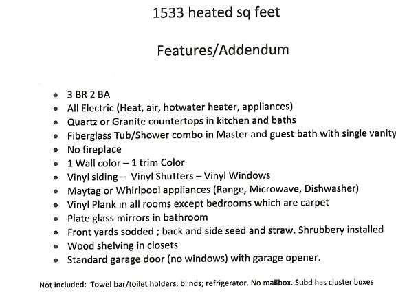New Construction 3 BR 2 BA, split bedroom plan. Open kitchen looks into greatroom. 100%. RD rural development financing available. Granite or Quartz countertops in kitchen and baths. LVP flooring throughout except bedrooms. Custom closets.