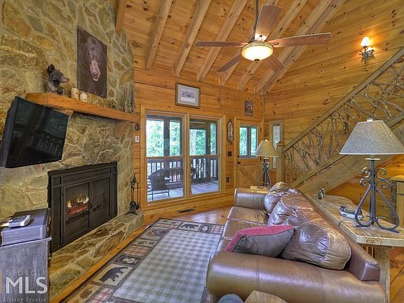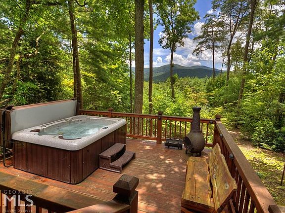 Enjoy year round mountain VIEWS from this homey luxury cabin. Featuring all wood interior, wood burning stone fireplace, 2 story vaulted ceiling w/exposed beams, antler chandelier & exposed staircase accented w/mountain laurel railings. Fully equipped kitchen w/custom hickory cabinets, hardwood counter tops & pantry. Bedroom & bath on each level, upper level bedroom has a private porch to take in the view, both baths feature hammered copper sinks and hardwood vanities. Enjoy coffee on the screened in porch or relax in the hot tub on the extended private deck. Great location between Blue Ridge & Ellijay, all paved roads. This can be your 2nd home that pays for itself; Fantastic vacation rental! Furniture Negotiable. List of recent improvements available.
