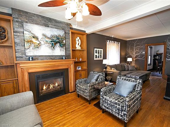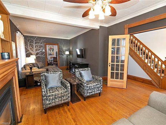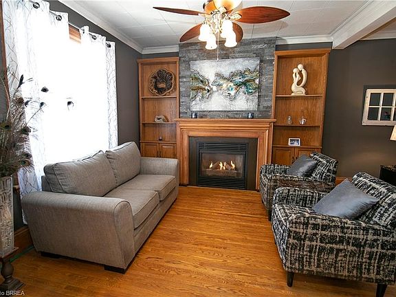 Brick home situated on a fenced deep lot. Double living room with French doors to foyer, hardwood floors and n/g fireplace. Separate dining room with access to the side yard. Main floor den/office great for home office can be converted to a bedroom. Two baths, a four pc on the main floor with claw foot tub, the updated upper bath with plumbed in shower behind the shelf. Hardwood in living rooms, den, and bedrooms. Quartz kitchen counters and stainless appliances. Bright main floor laundry and mud room combination. Fenced rear yard with fishpond and pump in front of shed. 96% efficiency natural gas furnace with central air. Garage is currently used for for storage. Just steps to Tutela Park with toboggan hill, rink, new splash pad, basketball court and playground.