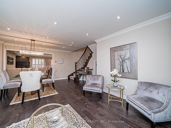 Open conceptCrown mouldingSmooth ceilingsGleaming hardwoodPot lightsLarge gourmet kitchenKitchen cabinet space