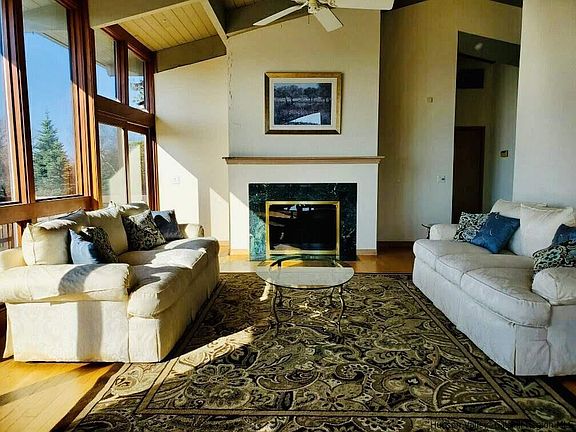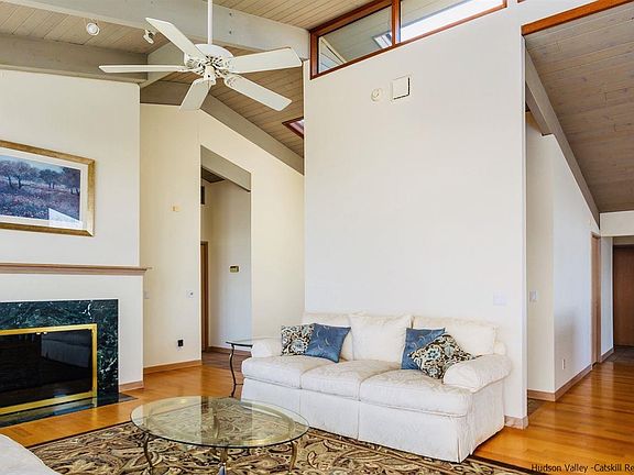 MAGNIFICIENT MOUNTAIN GETAWAY. Only 90 minutes from the GW Bridge, on the very top of the Shawangunk mountain range in the historic artist community of Cragsmoor, sits this large contemporary home. It's nestled on 4 + acres of beautiful woodlands and surrounded on two sides by the 5,000 acre Sams Point Preserve, a protected state park filled with fantastic hiking trails and known for its famous ice caves. Enjoy hiking out your front door. The peaceful views from the house are the same ones that inspired the mid-19th century artists from the Hudson Valley School. There are expansive windows throughout the home (all framed in rich wood) that contribute to a space that's enveloped by natural light with a deep connection to the outdoors. The property's landscaping includes perennial gardens, flowering bushes, and ornamental trees. This is truly a rare find. Nicknamed "Top of the Mount" by its only owners, the home was thoughtfully designed and built for enjoyment and sensibility to accommodate both larger groups and smaller, more intimate get-togethers. It comfortably accommodated up to 16 people in a combination of its 3 bedrooms, 3 baths, and 3 sofa beds, so it's perfect for gatherings of family and friends or as an Airbnb investment. The top level of the house is based on an open floorplan design, which is perfect for parties or lazy weekend afternoons. The grand area of the kitchen, dining room and living room (including a wood-burning fireplace), seamlessly blend into one another with fresh light from its glass doors, which open up to a large deck. It is ideal for barbeques or drinking a glass of wine while the sun sets over the mountain. That same level has a master bedroom suite with a sun-filled bathroom and a large walk-in closet. There is also a den/office area with a generous room attached for storage, a laundry room, and a staging room off the kitchen. It is excellent for storing fine dishes, glassware, and extra kitchenware to make entertaining more convenient. The lower level offers two bedrooms, a bath, a den with a fireplace, and a huge storage room. It is an ideal space for younger ones, guests, or for a mother/daughter/in-law arrangement. The last 4 beautiful photos are of areas on Sams Point Preserve.