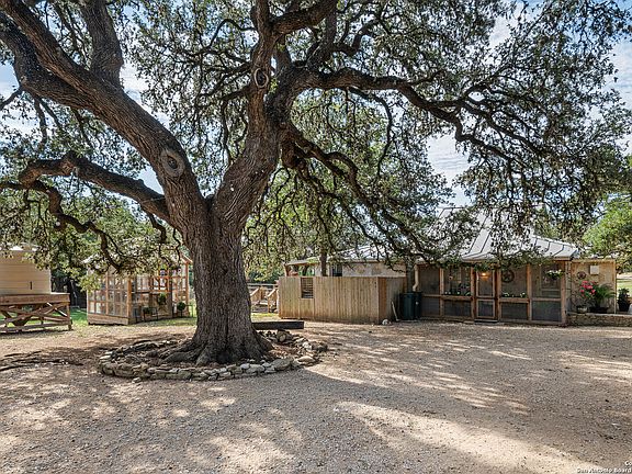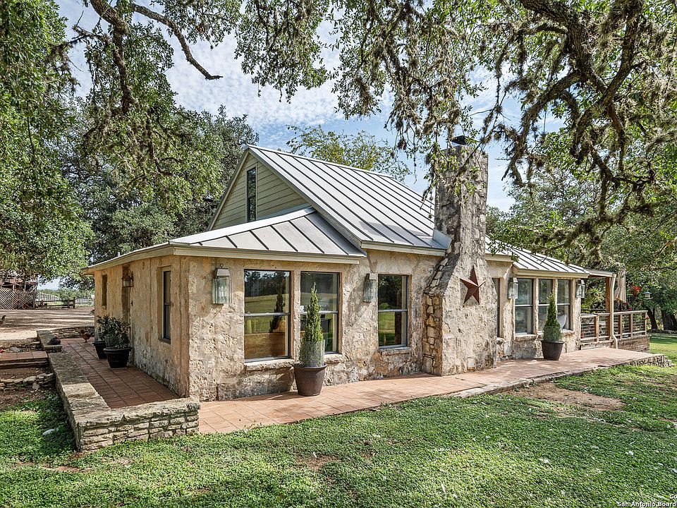 Just seven miles north of Boerne lies 46 Lewis Road-a serene 34-acre retreat where history, nature, and modern comforts converge in the Texas Hill Country. At the end of a quiet paved road, an electric gate opens to a limestone drive that reveals a sweeping seven-acre native meadow framed by century-old live oaks. These trees provide both privacy and a sense of timeless sanctuary. The land is as practical as it is beautiful. A three-acre field and 2.5-acre enclosed pasture offer space for livestock or equestrian pursuits. Rich soils support thick native grasses ideal for horses, cattle, or simply preserving the natural landscape. A six-stall horse barn with tack room, wash bay, turnout areas, and cross-fencing make it horse-ready. Two chicken coops, a greenhouse, and a deer-proof garden with shed and arbor trellis provide opportunities for self-sufficiency. A dog kennel with office and finished storage above, along with the original one-room historic structure-repurposed as a laundry room-add versatility. At the property's heart stands a 1,407 sq. ft. German rock home, built in the 1800s and fully remodeled in 2018. The restoration preserved its historic charm while updating every system for modern comfort. Natural textures, warm finishes, and classic design give the interiors timeless appeal. The home is served by a private water well and septic system. Double French doors from the living room and an entry from the kitchen open to a screened-in porch with handmade tile and sitting area-an all-season retreat for coffee, reading, or evening conversation. A large outdoor deck, added in 2018, features a full kitchen, seating, and fire pit, creating a perfect space for gathering under the stars. Nearby, tucked high into a 100-year-old oak, a finished treehouse retreat offers a fold-out couch and can serve as a hideaway for children, a reading nook, or a quiet sanctuary among the branches. Wildlife abounds, from whitetail and free-ranging axis deer to the songbirds that fill the air. With no city lights, the skies remain dark and perfect for stargazing. 46 Lewis Road is more than a property-it's a Hill Country escape where history whispers through ancient oaks and modern life slows to a peaceful rhythm.