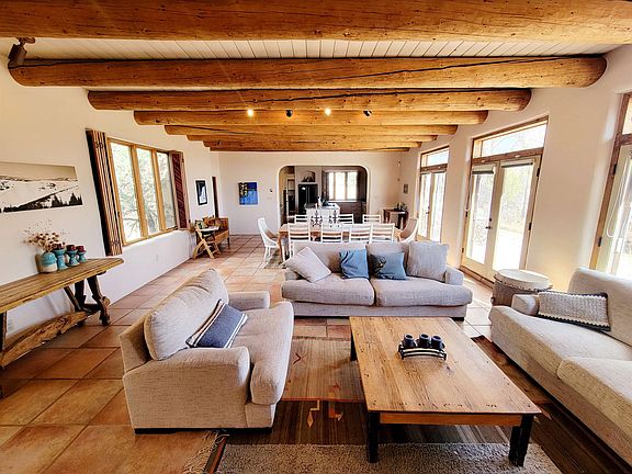 Located between Taos Ski Valley and Arroyo Seco, this 3 bedroom 2.5 bath in desirable Los Altos sits on the acequia and has amazing views of the Truchas to the south, and El Salto to the east, out of the kitchen window. The western deck will provide some amazing sunset views as well. Inside, you will find a large and inviting living space including a kiva fireplace. The primary has its own kiva fireplace too, and a large bathroom. Separated by the living area, you will find the two additional bedrooms, connected by a jack-and-jill bathroom. The additional half bath, just off the kitchen is a convenience for when you are entertaining. A large 2 car garage with extra storage allows you to keep all your belongings inside. HOA dues are $796/ quarter. The seller wishes to sell the house "as is". It does need stucco work, and some of the windows and doors will need to be repaired or replaced.