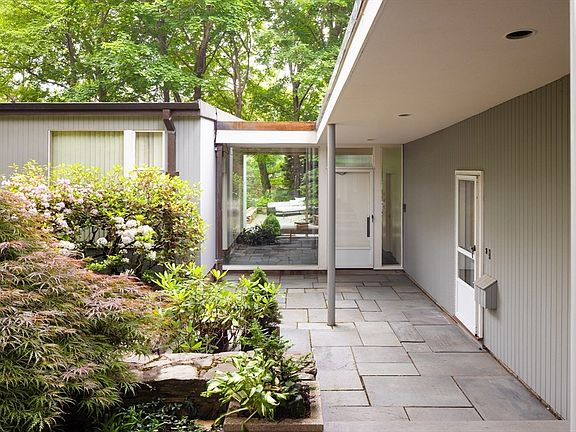 Available for the first time in over 40 years, this exquisite mid-century modern home sits on a lushly landscaped almost one acre lot in the coveted Chestnut Hill Historic District. Designed by renowned architect Stanley Myers and built in the 1950s for the founder of Sonesta Hotels, it has been lovingly maintained and updated while keeping true to the original style of the home. Many features are simply not available in newer homes – sumptuous custom built-ins done by true craftsman, dramatic floor-to-ceiling windows and a mason-built stone fireplace. The main level has a dramatic great room that seamlessly integrates with the stone patio, along with an oversized eat-in kitchen, direct entry to the 2 car garage & a powder room. Upstairs, find the primary bedroom suite with a private deck, dressing room & en suite bathroom, plus laundry, 3 more ample bedrooms & 2 more full bathrooms. The fully finished walkout lower level includes another bedroom & full bathroom, rec room & kitchenette