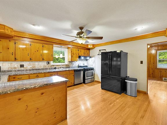 Welcome to 46 North Crown in Collinsville, IL. The current homeowners purchased it for many reasons including having the privacy of country living with the amenities of the city. Also, they loved the amount of living space there is; a large kitchen that's a cook's dream, with ample counter space and storage perfect for meal prep and entertaining. The large dining room, adorned with beautiful knotty pine details, is perfect for dinners and gatherings. The finished basement includes a family room, a full bathroom, and a versatile bonus room, perfect for a home office, gym, or guest space. Outdoor living is a pleasure with a spacious deck, ideal for summer barbecues and outdoor dining, overlooking the large private lot. The detached 2-car garage offers ample parking and storage space. With a roof only 3 years old, this home is ready to provide years of worry-free living. Nestled on a large, private lot, this home offers the perfect blend of rustic charm and modern amenities.