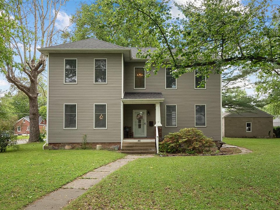 This charming 2-story home in Belleville is a must-see! With a large yard on a corner lot, you'll enjoy plenty of shade from the mature trees. As you step inside, you'll be greeted by a spacious living room with beautiful hardwood floors, a cozy fireplace with brick surround, and plenty of natural light pouring in through the windows. The well-appointed kitchen boasts ample cabinets, granite countertops, a stylish tile backsplash, center island, and walk in pantry. On the main level, you'll also find a cozy family room with custom built in book shelves, dining room, and a full bathroom with ceramic tile floors. Upstairs, you'll discover three generously sized bedrooms including the master suite. Plus, there's a detached 2-car garage and additional parking at the rear of the home. This home has too many attributes to list, come see it for yourself! Additional Rooms: Sun Room