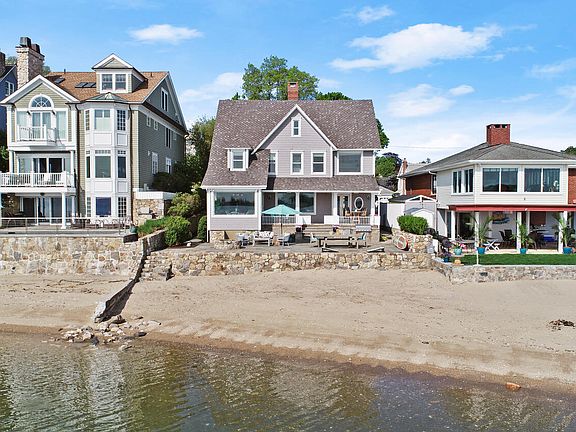 Discover the allure of this antique oceanfront residence, boasting its own sandy beach and captivating vistas. Four levels of living space include a charming living room with marble fireplace, built-in bookcases, and French doors that open to a covered porch and a stone patio with firepit—a perfect setting for outdoor gatherings. The eat-in kitchen features a gas range, granite counters and stainless steel appliances. The seaside dining room provides breathtaking panoramic views. The primary bedroom suite offers breathtaking vistas, a sizable walk-in closet, and an updated bath with Carrera marble. The third floor offers versatile space, plus additional bedroom or office, and a full bath. The finished lower level includes a wine room and is well-suited as a recreational area. Must see!