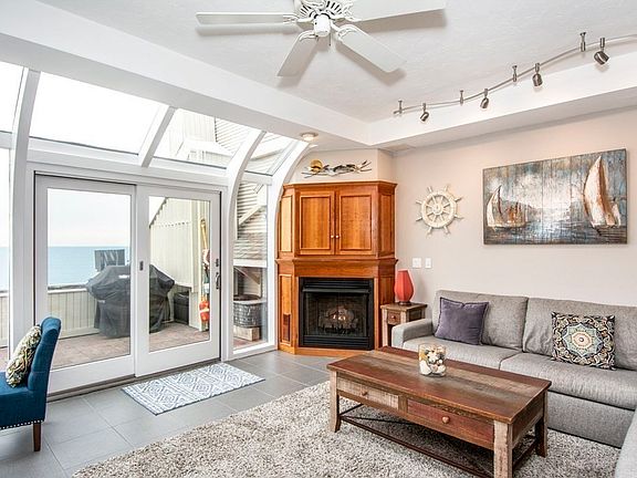 Experience spectacular ocean views from this lovely one bedroom WATERFRONT condo at Atlantic Hill II Condominium, also known as The Pyramid building! With its awe-inspiring seaside setting high above the Atlantic Ocean, this fourth floor unit has stunning views of Nantasket Beach & Boston Light. You're so close to the ocean, you feel like you’re on a ship! All of this to behold from your living room, with its wall of "greenhouse" windows (all new), leading to a private outdoor deck. Other highlights include new gas fireplace with new custom built-in cabinetry; updated kitchen with SS appliances, granite counters, open dining area; master bath with jacuzzi tub & laundry, and large bedroom! Tiled floors thru out, GAS heat, Central Air, & garage parking for you and your guests ~ so convenient to unit! Ideal vacation getaway or year round coastal living! Time to live by the sea! Great location & walkability to all Hull offers!! Train & Ferry to Boston minutes away!