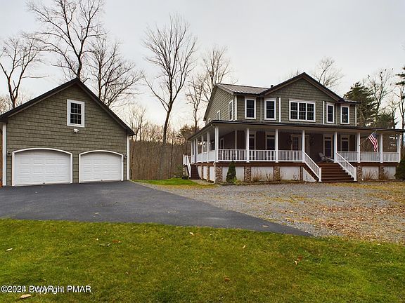 Gorgeous colonial farmhouse on 10 plus River front acres bordering the Lackawana State Forest. 383 feet of frontage on the upper Lehigh River which is rated as exceptional value by DEP. This 4 bedroom, 3 bath home with a 2-car detached garage is nestled on lots of land in the beautiful Poconos. Main level has wide plank natural white oak flooring and boasts a kitchen with granite countertops, gas stove with double oven, and ss appliances. A dining area with sliding doors leading to a large screened in porch with 3 skylights and mahogany decking. The living room has a stone wood burning fireplace. The foyer has 8' tall French doors that open to a covered wrap around porch with mahogany flooring. Primary bedroom has a walk-in-closet and private bath with custom walnut cabinetry, a claw foot tub, and a large, tiled shower. The bedroom also has sliders to another mahogany deck. The upstairs has a large family room, 2 large bedrooms, a full bath, and an additional office/den. Lower level has a workshop & craft room with custom cabinetry, laundry room and storage. Outside features include metal roof, exterior of stone and cedar vinyl shakes, a paved driveway, detached 2 car garage, a wraparound front porch, outdoor shower, and a fire pit. This home has it all!Please use Google maps for a street view of home.