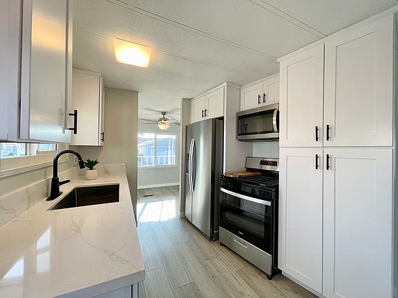 NEWLY REMODELED 2 Bed, 1 Bath Mobile Home For Rent in Rancho La Paz All Ages Mobile Home Park. Only $2,595 per month. This Amazing Home will go fast! Enjoy this Beautifully Remodeled Home, Including New Vinyl Plank Flooring, New Paint, New Cabinets, Beautiful New Stainless Steel Appliances, and more. Inside, you will find 2 Spacious Bedrooms, A Large Galley Style Kitchen with High-Quality White Cabinets with Soft Closing Doors and Drawers, New Custom Quartz Countertops, and New State-of-the-Art Stainless Steel Appliances, including a Gas Stove, Dishwasher, Side-by-Side Refrigerator, Microwave, and Washer and Dryer. You will also find Custom Lighting and Plumbing Fixtures throughout and Newly Installed Energy Saving Dual Pane Windows. The Master Bedroom is very Spacious and offers a Huge Walk-In Closet. Outside, you will find a Large Covered Front Porch, Covered Parking for 2 Vehicles, and a Nice Shed for Convenient On-Site Storage. You must see this great home before it's too late. Priced well below similar rentals in the area. Rancho La Paz is a Premium All-Age (Family Friendly) Mobile Home Park located in East Anaheim and close to shopping, restaurants, and activities. Enjoy the Sparkling Community Pool and Spa and Large Community Center as well. Renter pays water, gas and electricity. 2 small pets allowed total.