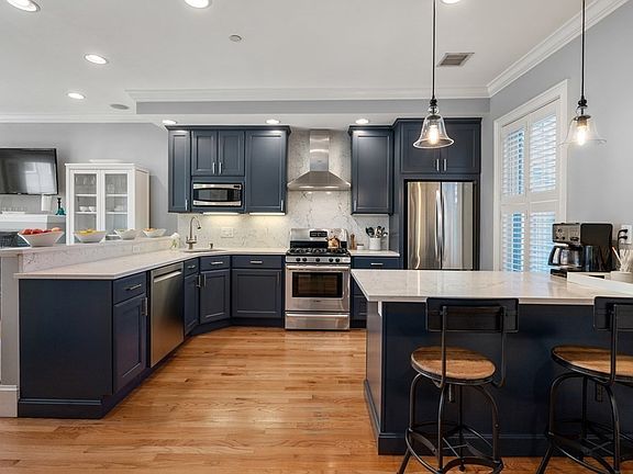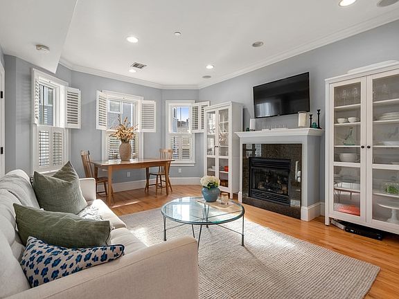 Sophisticated Gas Light 2BD+Office/2BA w/fabulous floor plan + exclusive-use roof deck. Well-renovated flat features gleaming hardwood floors, open layout, excellent closet space + tall ceilings. Step inside & find an incredible chef’s kitchen w/custom Shaker cabinets, quartz counters, ss appliances & substantial breakfast bar. Off this space, the living room w/fireplace & bay window, the perfect place for a dining table. Primary suite w/double closets & ensuite bathroom w/spectacular glass enclosed tile shower & double vanity. Guest bedroom, freshly renovated second bath with high end tile & fixtures + separate bonus room complete the space. Roof deck w/gas line & stellar city views awaits. Other: central air, en-suite laundry, plantation shutters, basement storage.
