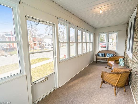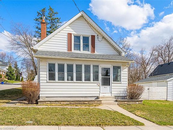 Adorable and affordable!!! Fabulous location walking distance to downtown, local craft brewery & the GO! Charming detached with covered front porch and tons of character with original trim, doors and hardware. Cozy living room with gas fireplace and good-size formal dining room. Two spacious bedrooms with large closets. Great basement with finished rec room, huge windows, large laundry room & ideal area for storage. The deck space is awesome plus there is a single car garage and shed. Get into the hot real estate market ... It's a detached in a prime location!