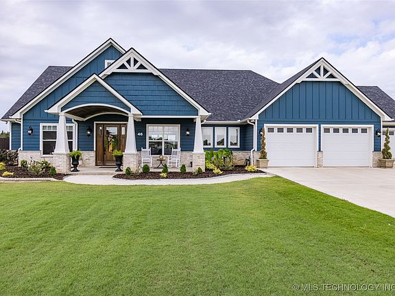This stunning custom-built smart home, completed in 2022 with numerous upgrades including a theatre room, office, shop and new gunite pool. The open-plan living area features built-ins, a brick corner fireplace with gas logs (and a fluted chimney for wood), and a stylish dining room with a contrasting brick wall. The kitchen is equipped with a propane cooktop, double oven, under-counter microwave, ice maker, island, quartz countertops, farmhouse sink, and a large pantry with double doors. The spacious Master Suite includes a luxurious bathroom with double sinks, oversized tub, heated flooring, and a walk-in shower, plus a large closet that connects to a beautiful laundry room with built-ins, and a work space. The home features custom window coverings, a tankless water heater, and a charming mudroom. The 3-car garage accommodates large vehicles and includes a safe room, attic lift, generator plug, and a third bay with doors on both ends for easy access to the backyard shop building. With the heated pool and a shop the backyard is ready for your outdoor entertaining Schedule your showing today!