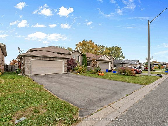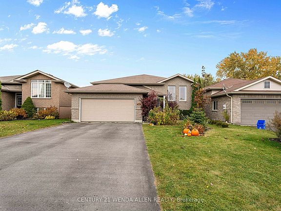 Offers anytime!! All brick 3+2 br raised bungalow in a great neighbourhood close to the 401. No sidewalk to shovel. Open concept main floor. Hardwood floors on the main floor living and dining. Kitchen features S/S appliances with microwave shelf, backsplash, large pantry and plenty of counter space. Walk out from the breakfast area to a covered deck with stairs leading down to a lower deck. Feature wall in dining room. Living room overlooking the front yard. Primary bedroom with semi-ensuite. Finished lower level features berber carpet, a 4 piece bath, 2 more bedrooms, and living room with gas fireplace and large windows. Fenced yard with 2 apple trees plus strawberries, grapes and raspberries. Garage has a storage loft. A/C 2022 and HWT owned.