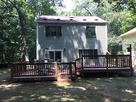 Affordable unique style home set on level property located on a one way tree lined street convenient to routes 206 and 80. Enjoy the peace and serenity as you walk down the path behind the home to the Musconetcong River. Inside the home offers a spacious floor plan with vaulted ceiling & skylights in living rm, formal dining rm w/ slider to deck, updated eat in kitchen w/ granite counter top tile back splash ceramic tile floor, powder rm, family rm & laundry. 2nd fl .has new carpet in 3 Br's & hallway. Back yard has large deck approx 26x16 and large storage shed as well. All rooms have programmable thermostats to control heat. Seller is on 12 month electric budget cost is approx $204. Excellent school system and opportunity.