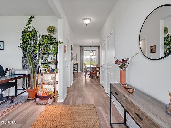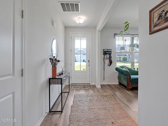 This stunning 4 bedroom home has all you are looking for! Nestled on a .35 acre lot close to the Intracoastal waterway, this beautifully maintained 2018 build welcomes you with a bright entryway leading to an open-concept living area. The home is flooded with abundant natural light and features a beautifully appointed kitchen which includes ample storage with a large pantry, stainless appliances, tiled backsplash and a large island that provides tons of prep space and serves as a gathering spot. The dining area with glass doors leading to the screened-in patio transitions between indoor and outdoor living, perfect for entertaining friends and family. All 4 bedrooms are generous in size and the master suite offers a luxurious ensuite bath, and two spacious walk-in closets. Located within the coveted Topsail school district and close to shopping, restaurants and easy water access!