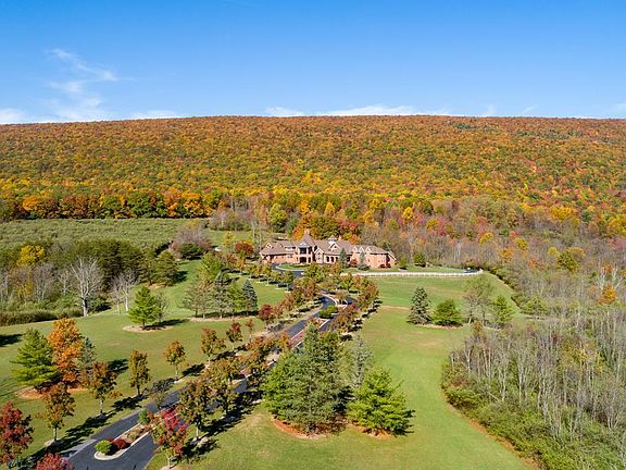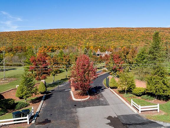 STUNNING BRICK MANSION on 257 private acres and adjacent to 1000 acres of state game lands! Secure, gated entrance; tree-lined, paved driveway that winds throughout the property and exits at the 2nd gated entrance along Scotch Valley Road; 2+ ponds: a grand porte-cochere; a 6-car attached garage; a 4-bay garage w/apartment above it; a detached 2-car garage; 5 bedrooms; 9 bathrooms; 5 gas fireplaces; indoor and outdoor fountains; sky-high ceilings; ornate windows; custom honey-maple kitchen cabinetry; a butler's pantry; 2 wet bars; a theater room; an exercise room; incredible interior and exterior lighting; a chandelier that lowers with a push of a button for cleaning; geothermal heat; central vac; multiple porches; and million-dollar views from every direction.