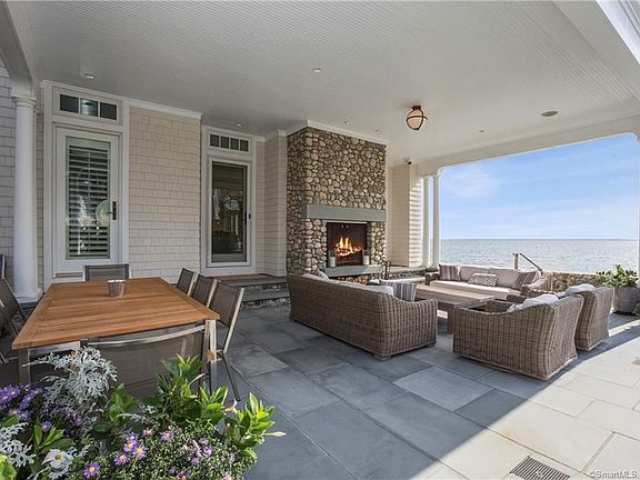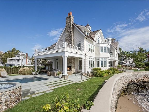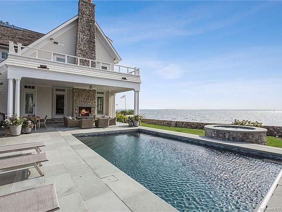 MAGICAL WATERFRONT LIVING - Spectacular, private waterfront gem on .46 acres with breathtaking views of the L.I. Sound located on Bell Island with your own private beach, pool, spa and covered porch with fireplace; custom built in 2014 by Artisan Builders. Soaring three story entry leads to open floor plan featuring southern exposure with state-of-the-art kitchen offering exceptional detail, lighting, moldings and built-ins throughout. Three gas fireplaces inside. Master bedroom suite with walk-in closet, radiant heated floors in bath plus sitting room with French doors to balcony overlooking the water. Three additional bedrooms all en suite. Third floor has bunk room with full bath plus exercise room. Enjoy all that Rowayton has to offer and close proximity to NYC. Mooring availability