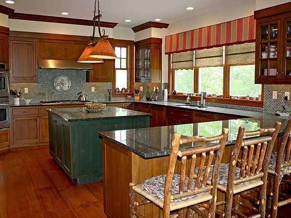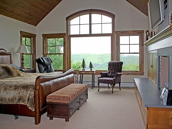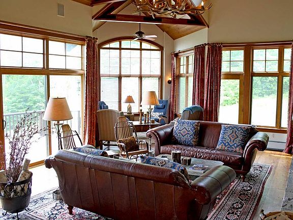 Magnificent slopeside Adirondack Lodge in private setting. Beautifully sited between a mountain stream and the Daybreak Trail, this quality home offers direct ski-on, ski-off access as well as sweeping views of the trail and the hillside beyond. Custom features throughout include gourmet kitchen with commercial range, stainless steel appliances, and breakfast bar. Spacious living room with cathedral ceiling is centered by a handsome floor-to-ceiling stone fireplace and fronted by a wall of glass, filling the rooms with natural light and giving access to an expansive deck overlooking the trail and views. Master bedroom suite with gas fireplace and separate office space offers a great work-at-home option. Master bathroom includes soapstone counter tops, tiled glass-enclosed shower, and tub overlooking the view. Guest bedroom suite. Large ski room leads out to the trail and to the hot tub, perfect for soaking under the stars while absorbing the natural beauty of this very special setting.