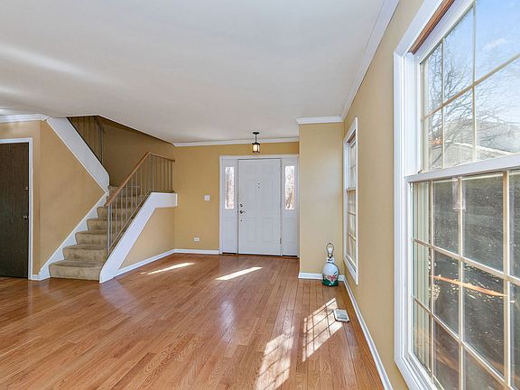 End unit 2-story town home with full walk-out basement. Hardwood floors on the main level. Spacious & bright living room with crown molding. Large kitchen with lots of storage, maple wood cabinets, & breakfast bar. Dining room features sliding glass door out to big deck with views of a private wooded area. No one behind you! The second level features three spacious bedrooms. The primary bedroom offers a sitting room or convert to a 4th bedroom. Be impressed by the huge walk-out basement with endless possibilities. Sliding glass door leads out to a patio. 1 car detached garage. You are going to enjoy Bright Oaks neighborhood offering a maintenance free community featuring outdoor pool, clubhouse, park, & a wooded setting. Walking distance to shopping. Use your imagination and make this home your own!