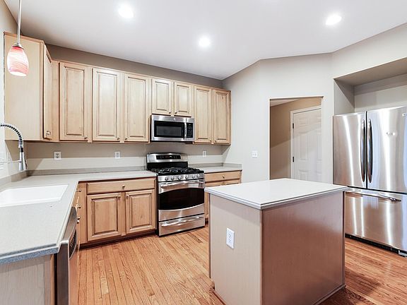 A lovely single family home on cul-de-sac is just perfect with all new paint and carpet. Three finished levels with 4 bedroom and 3.5 baths. Lovely kitchen with center island, stainless appliances, breakfast room and a very large adjoining family room with gas fireplace. Upper level offers an expansive primary suite with full bath and walk in custom closet. Convenient upper level laundry. Basement is finished with a 2nd family room, full bath and unfished area for storage. Lovely rear patio overlooks common area. The property is ideally located with it's walking distance to town which offers: restaurants, grocery store, gift shop, coffee shop, doctor, pharmacy... And access to the 90 acre park with trails, soccer and ball fields and a dog park. A local community center has a swimming pool and work out facility. Everything you could want in one little town. Minimum 12 months, maximum 24 months. Very good credit and no smoking